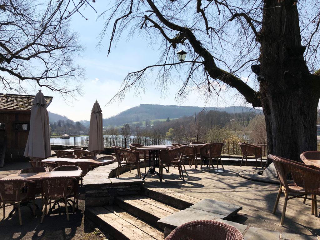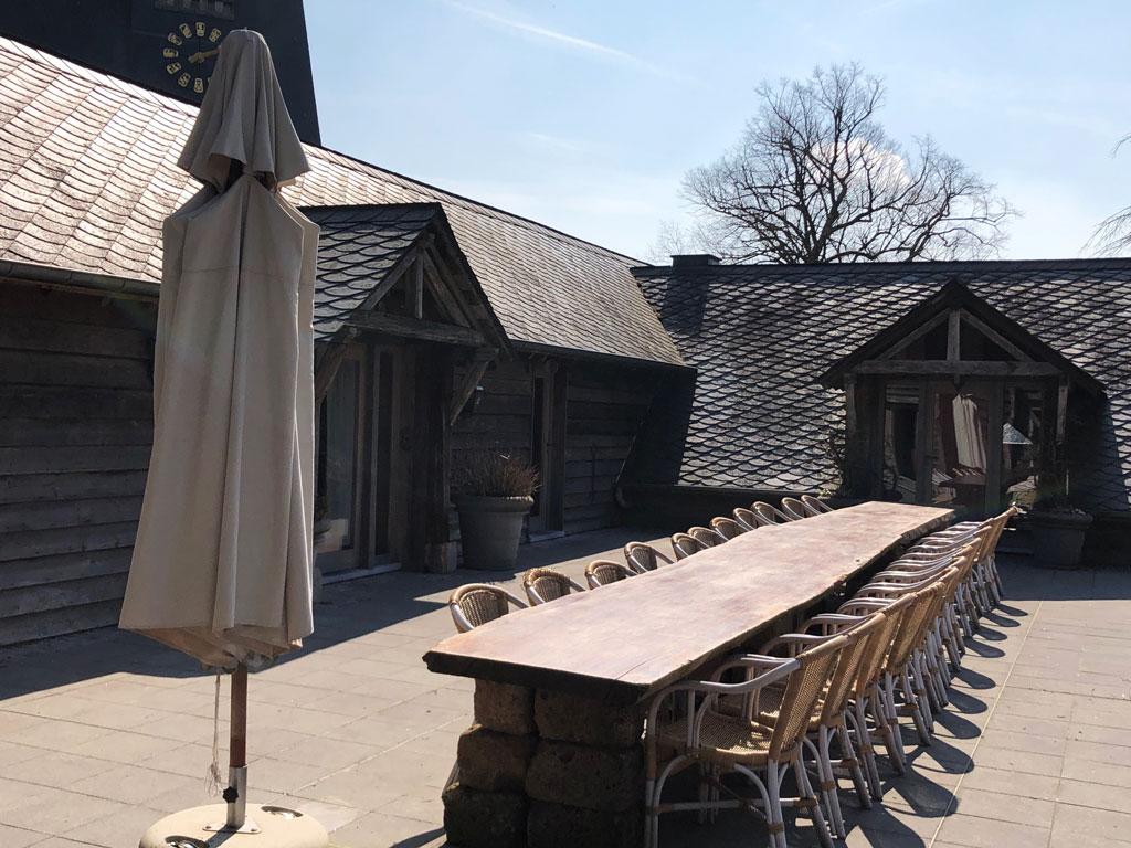 - Große Terrasse mit Tischen und Stühlen