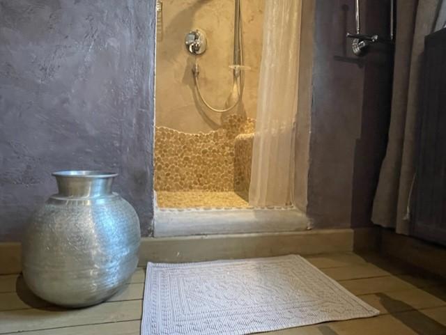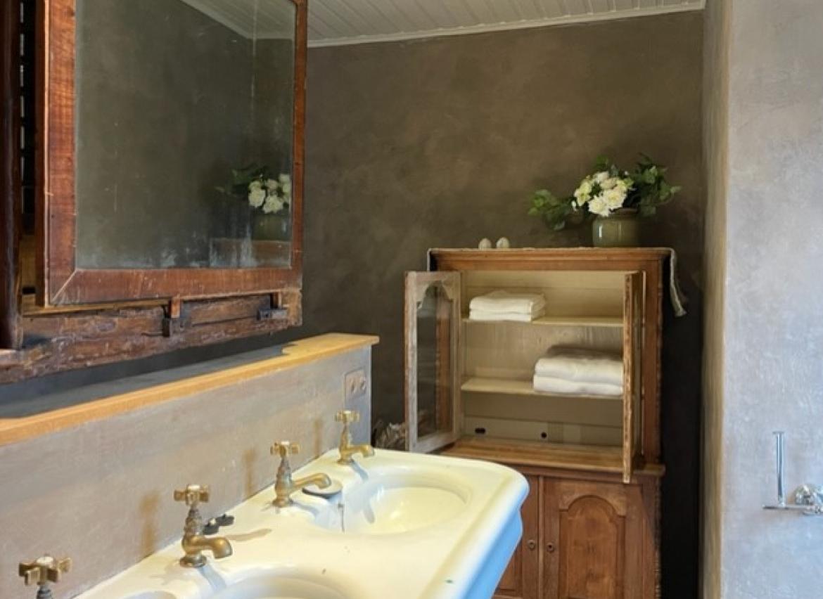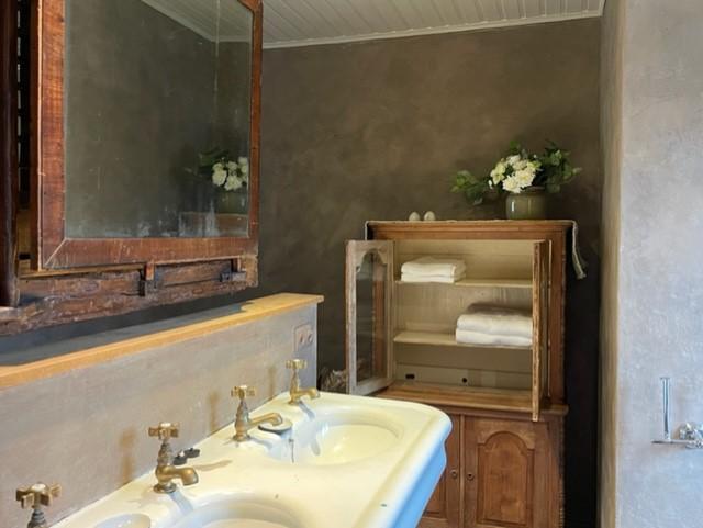 Angrenzendes Badezimmer mit Dusche, 2 Waschbecken und WC