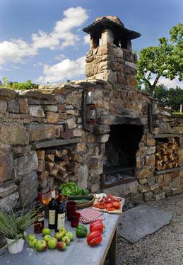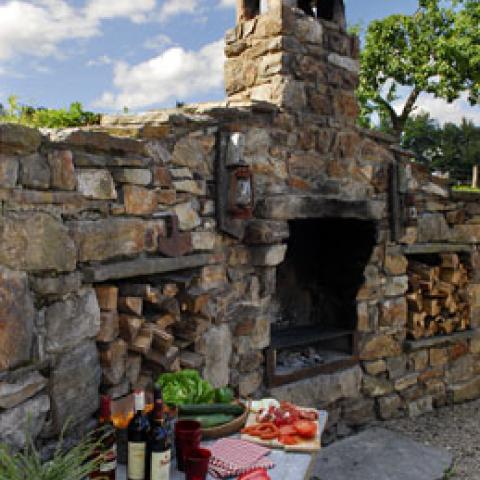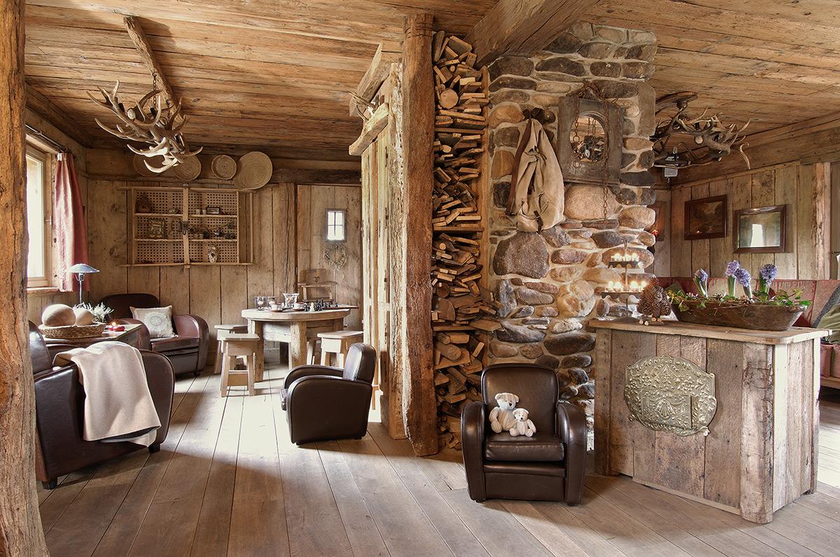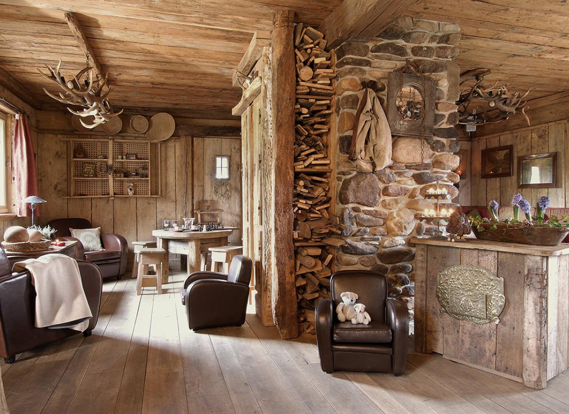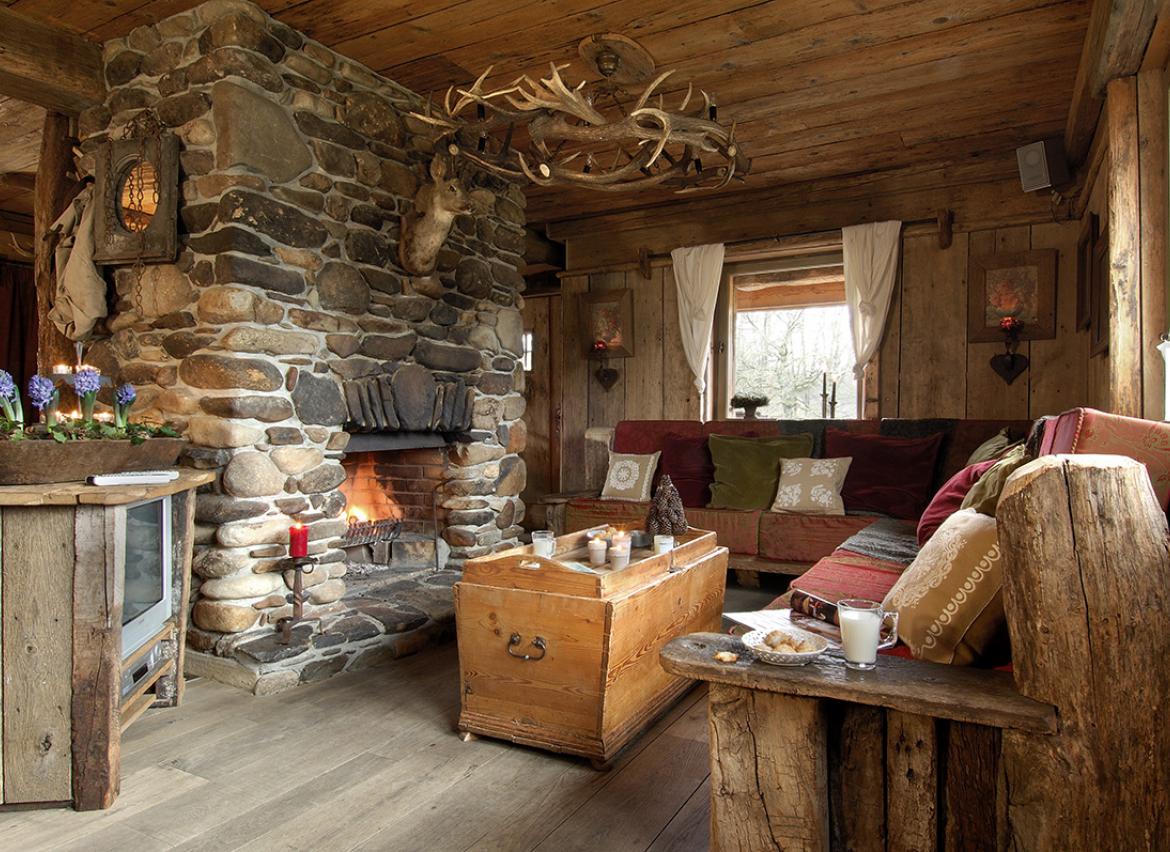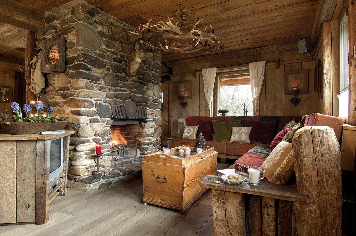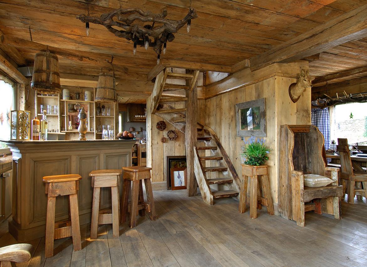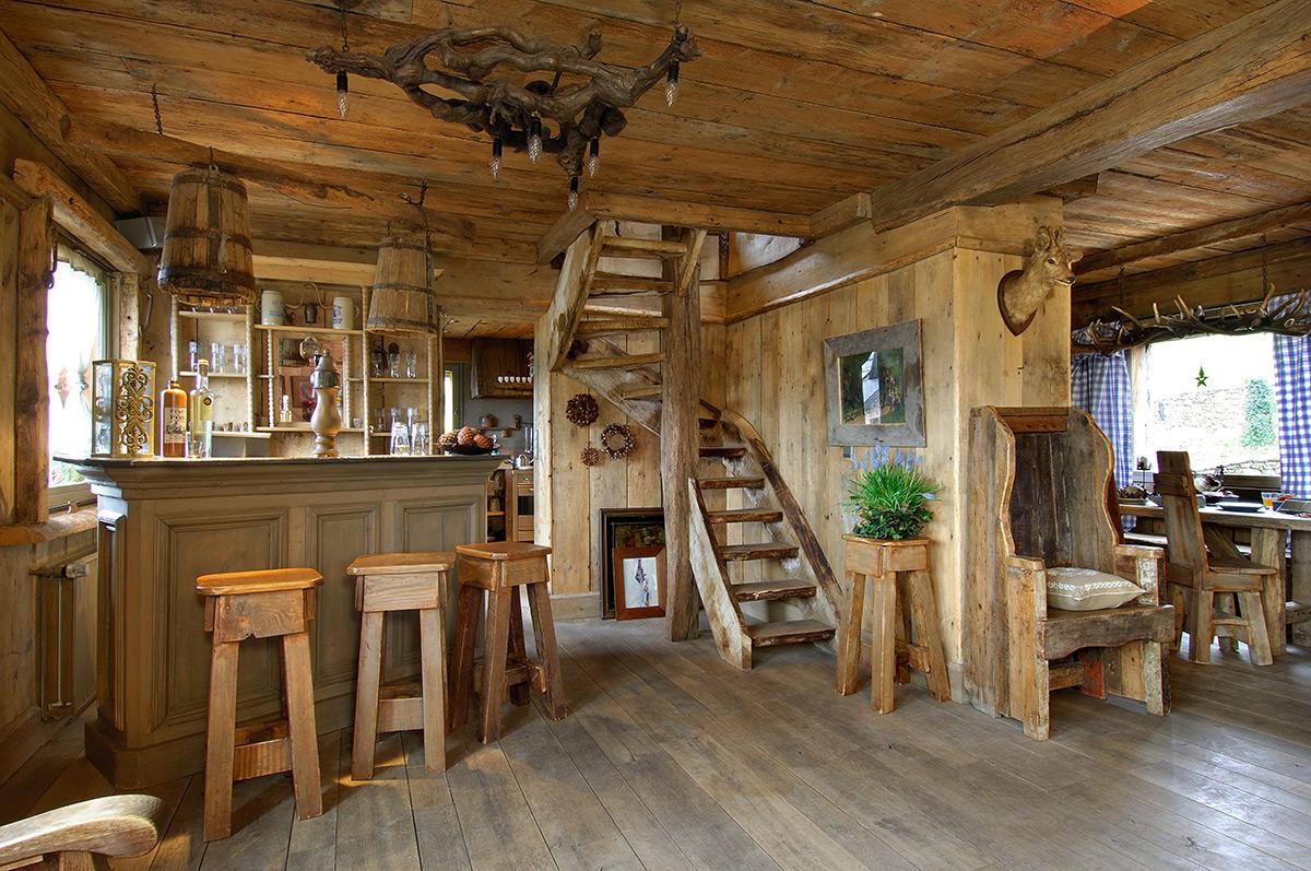 • salon avec cheminée ouverte, TV et coin bar avec pompe à bière