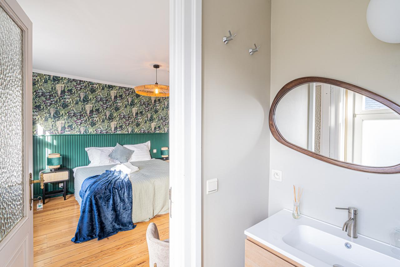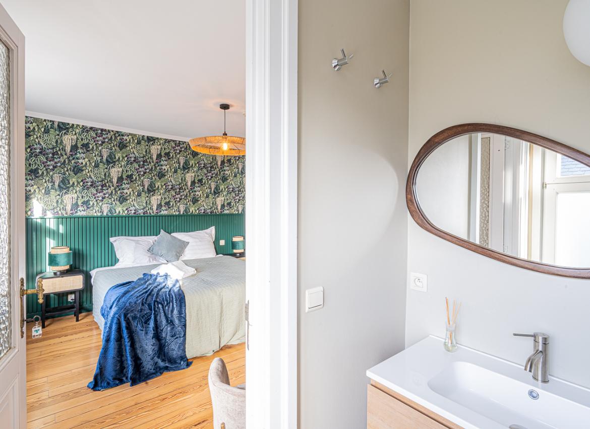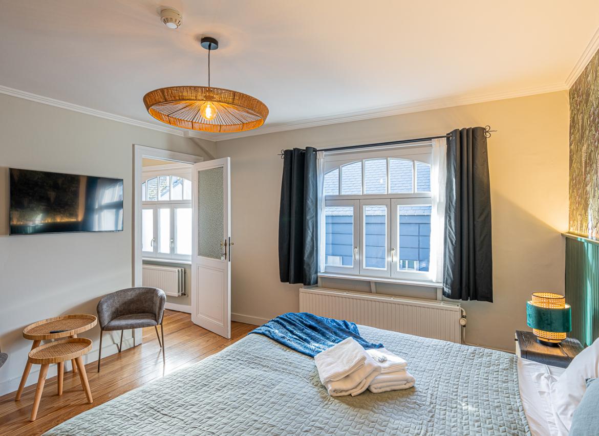 • 1 chambre pour 2 personnes, lit ‘double’ (matelas 160x200), grande salle de douche et WC (idéale pour PMR)
