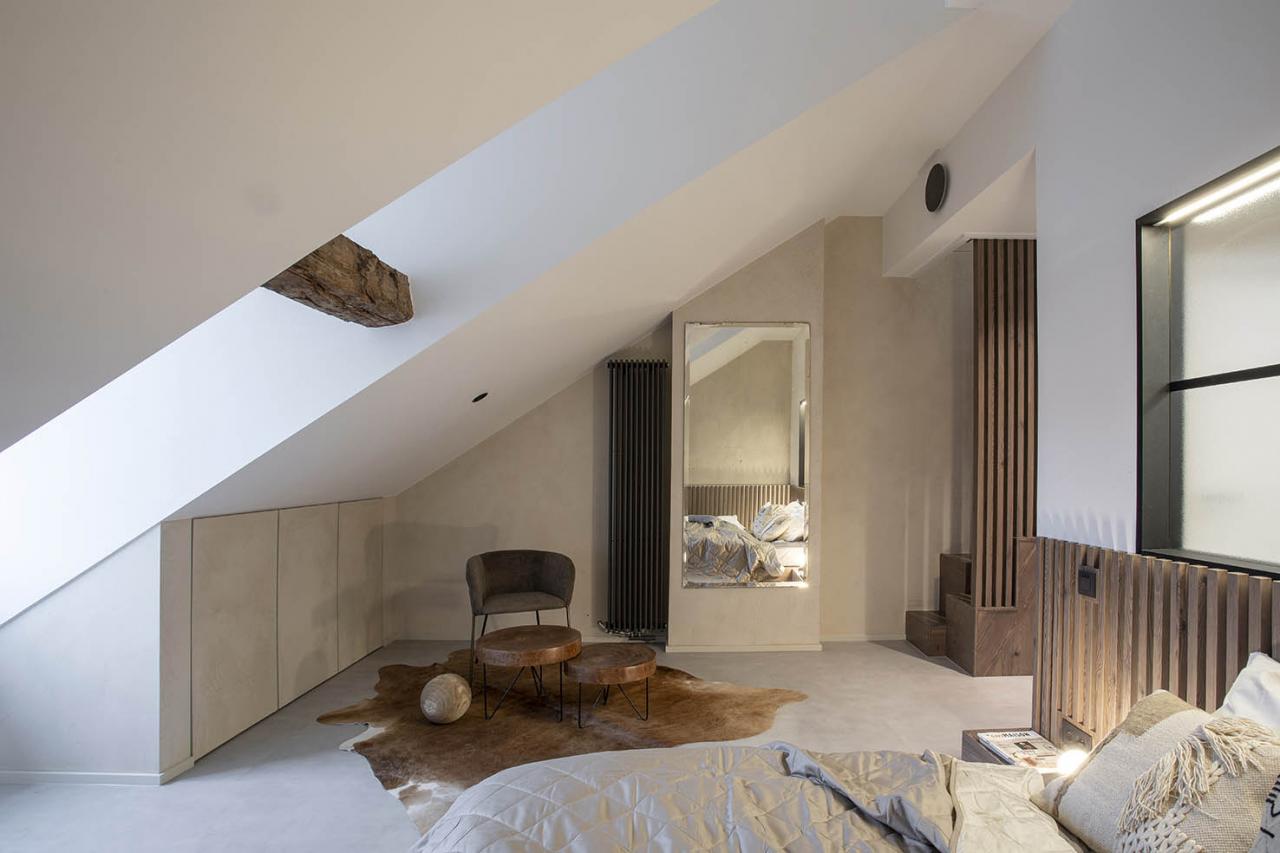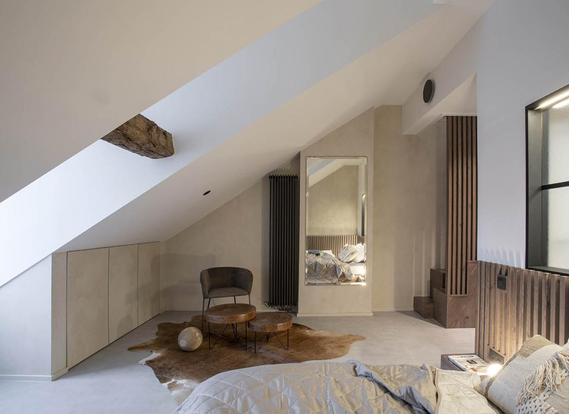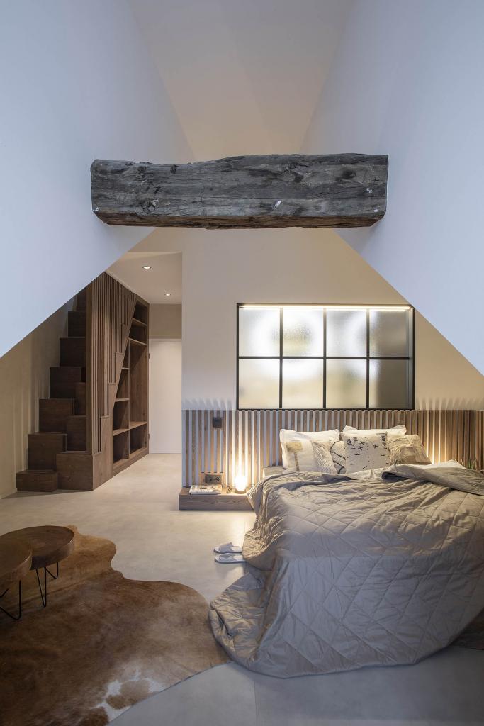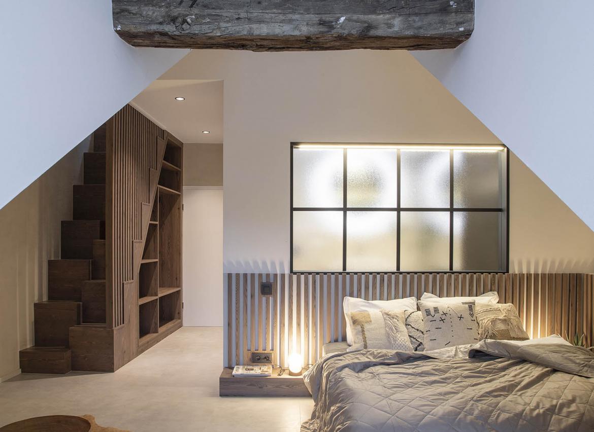 • 1 grande chambre avec mezzanine pour 4 personnes,1 lit ‘double’ (matelas 160x200) + salle de douche avec WC séparé en bas, 1 lit double (2 matelas 90x200) + baignoire sur la mezzanine